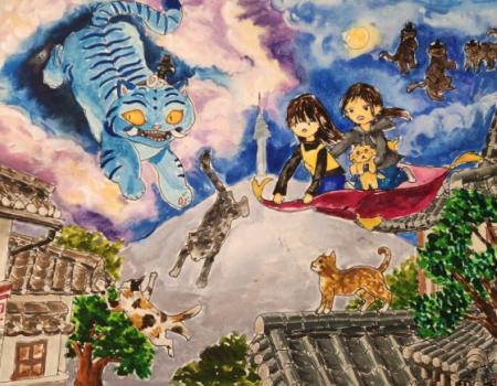 이 작품은 7세 아이의 작품이라고 믿기 어려울 만큼 주제 의식이 뚜렷하고, 강렬한 색채 대비와 역동적인 구도를 통해 관람자의 시선을 사로잡는 힘을 가지고 있습니다. 기술적인 완성도를 넘어, 우리나라의 문화 유산을 자랑스럽게 여기는 아이의 마음이 그림 속에 고스란히 담겨 있어 큰 울림을 줍니다.