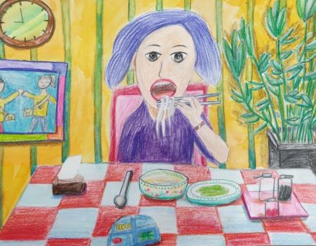 🍜 9세 아동(여아) 그림 평가: 식사하는 모습 이 그림은 구도, 색감, 주제 표현 등 여러 면에서 9세 아동의 평균적인 표현 능력을 뛰어넘는 매우 훌륭...
