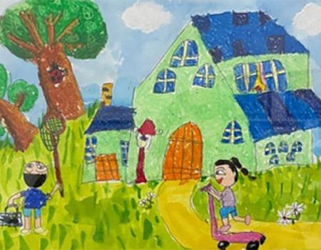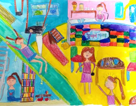 💖 이 그림은 초등학교 1학년 학생이 그린 놀이터 카페라는 주제를 아주 밝고 즐겁게 표현한 작품이네요! 엄마와 함께 간 즐거운 경험이 그림에 고스란...