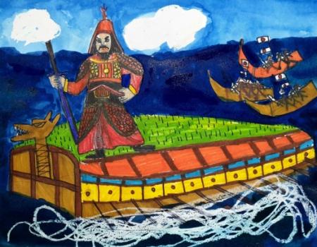 ⚔️ 이 그림은 초등학교 1학년 학생의 작품이라는 것이 믿기지 않을 정도로 에너지와 주제 표현력이 뛰어납니다! 🌊 역사 속 위인의 모습을 주제로 삼았...