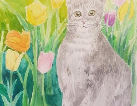 🐈 초등학교 5학년 작품 평가 (고양이와 튤립) 이 작품은 대상을 매우 섬세하게 관찰하고 다양한 재료를 능숙하게 혼합하여 그린, 수준 높은 정물/동물...