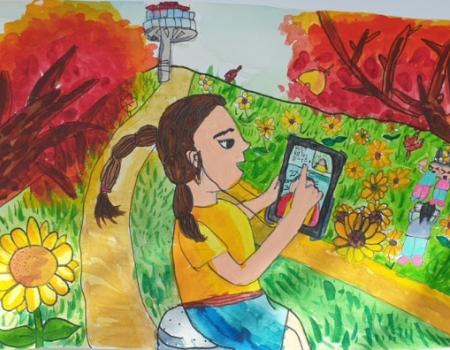 💻 초등학교 2학년 작품 평가 (태블릿과 가을 풍경) 이 그림은 현대적인 일상과 아름다운 자연을 결합한 독특하고 흥미로운 작품입니다! 초등학교 2학...
