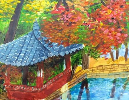 🍁 초등학교 5학년 여아 작품 평가 (아크릴화 - 가을 정자 풍경) 이 작품은 아크릴 물감의 특성을 잘 이해하고 활용한, 매우 인상적이고 숙련된 그림입...