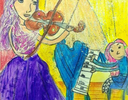 🎻 7세 여아 작품 평가 (바이올린 연주) 이 그림은 화려하고 극적인 색채와 생동감 있는 인물 묘사가 돋보이는, 매우 개성 강하고 매력적인 작품입니다...