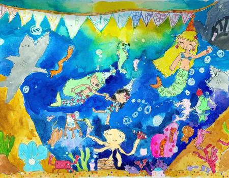 🐠 와, 이 그림은 정말 환상적이고 상상력이 풍부한 작품이네요! 초등학교 1학년 학생이 그린 '인어공주의 생일파티 초대'는 바닷속의 축제를 생생하고...