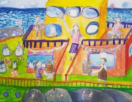 🥳 초등학교 2학년 여아 작품 평가 (바닷가 생일 파티) 와, 이 그림은 정말 이야기가 풍부하고 따뜻한 작품입니다! 복잡하고 다양한 장면들을 하나의 ...