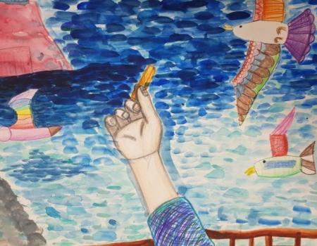 🍘 초등학교 2학년 작품 평가 (갈매기에게 새우깡 주기) 이 그림은 주제가 독특하고, 화면 구성이 매우 역동적인 훌륭한 작품입니다! 아이의 관찰력과 ...