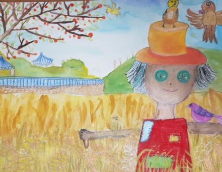 🌾 초등학교 2학년 작품 평가 (허수아비와 가을 풍경) 이 그림은 따뜻하고 포근한 색감과 동화적인 분위기가 아주 매력적인 작품입니다! 초등학교 2학...