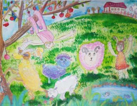 🐑 초등학교 2학년 작품 평가 (신나는 과수원 친구들) 이 그림은 역동적인 움직임과 밝고 자유로운 분위기가 가득한, 매우 흥미롭고 재미있는 작품입니...