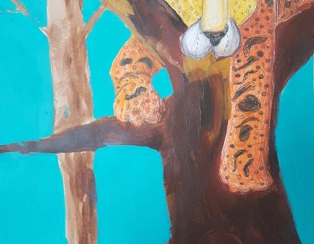 🐅 초등학교 2학년 남아 작품 평가 (나무 위 호랑이와 토끼) 이 그림은 강렬한 색 대비와 대담한 주제 설정이 매우 인상적인 작품입니다! 초등학교 2학...