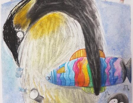 🐧 초등학교 3학년 작품 평가 (펭귄과 무지개 물고기) 이 그림은 강렬한 명암 대비와 몽환적인 분위기가 매우 인상적인 작품입니다! 초등학교 3학년 학...