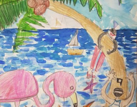 🌴 초등학교 3학년 작품 평가 (열대 섬의 휴가) 이 그림은 개성 강한 캐릭터와 명랑한 색채가 돋보이는 매우 흥미롭고 재미있는 작품입니다! 초등학교 ...