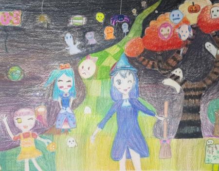 🎃 초등학교 4학년 여아 작품 평가 (할로윈 파티) 이 그림은 풍부한 상상력과 다채로운 캐릭터가 돋보이는, 매우 재미있고 활기찬 작품입니다! 초등학...